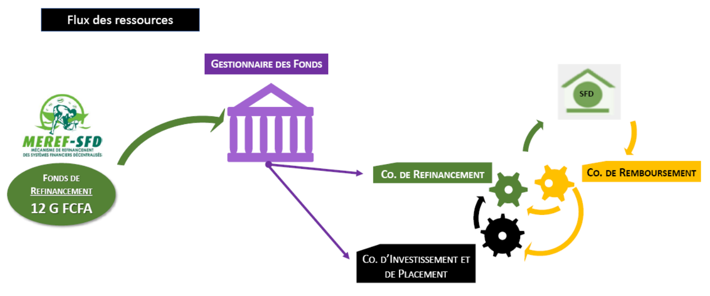 GOUVERNANCE DU MEREF-SFD: Le Comité d’Orientation, organe de décision piloté par le Ministre en charge de la Promotion de la Microfinancele Comité d’Audit, organe de contrôle est présidé par le réprésentant diu Ministre chargé des Finances; la Cellule Technique de Coordination du MEREF-SFD, organe de direction dirigé par un Coordinateur.